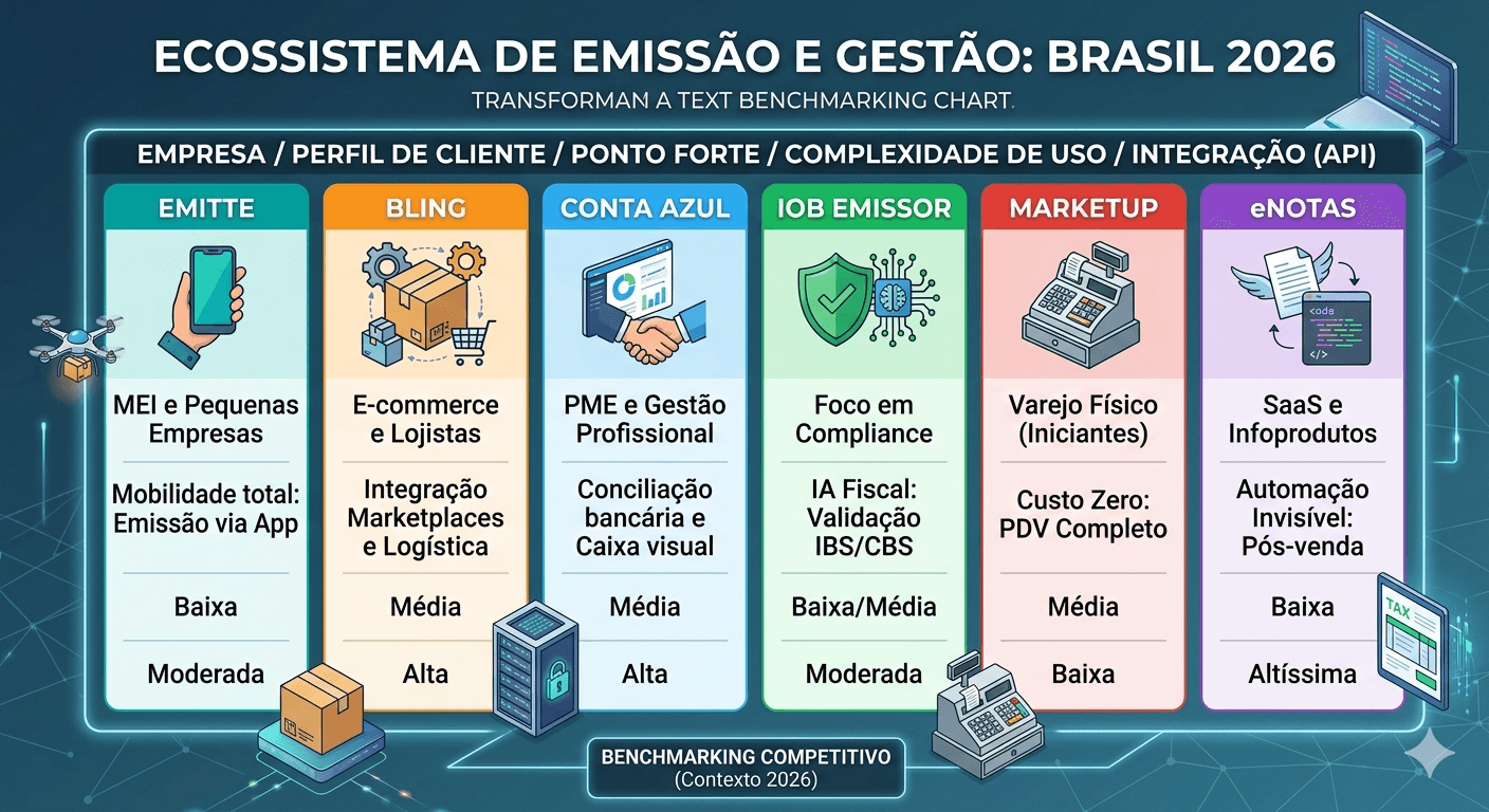 Para interpretar o benchmarking da Emitte, é preciso entender que ela se posiciona como um "especialista em emissão" (focado em agilidade e mobilidade),enquanto muitos de seus concorrentes são ERPs (Sistemas de Gstão) completos que incluem a emissão como um módulo.