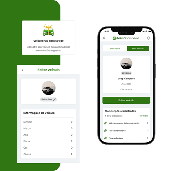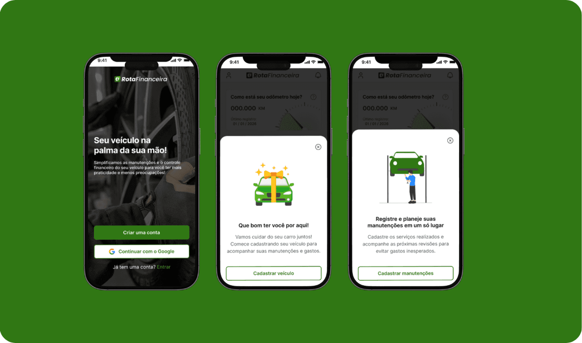 Initial screens of Rota Financeira, preparing the user to organize vehicle maintenance costs.