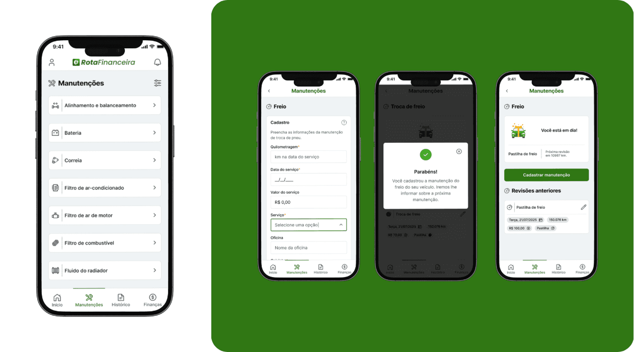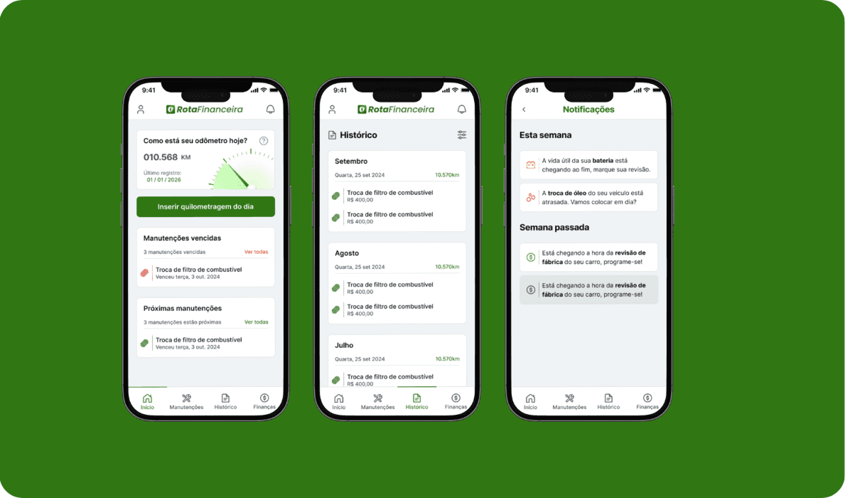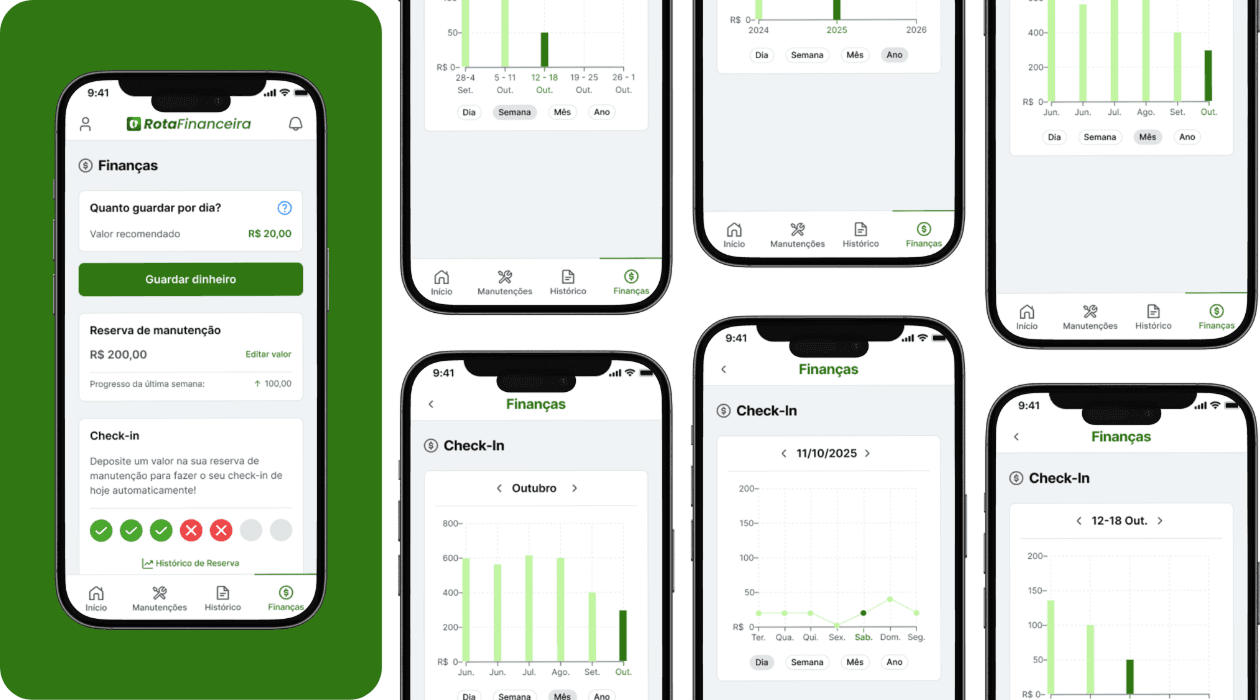 Rota Financeira is a small Brazilian startup focused on developing a product that helps ride-hailing drivers manage their finances and vehicle maintenance, efficiently balancing income, expenses, and goals. Additionally, the app helps drivers organize and remember important maintenance tasks, preventing unexpected expenses and wasted time due to unplanned stops.