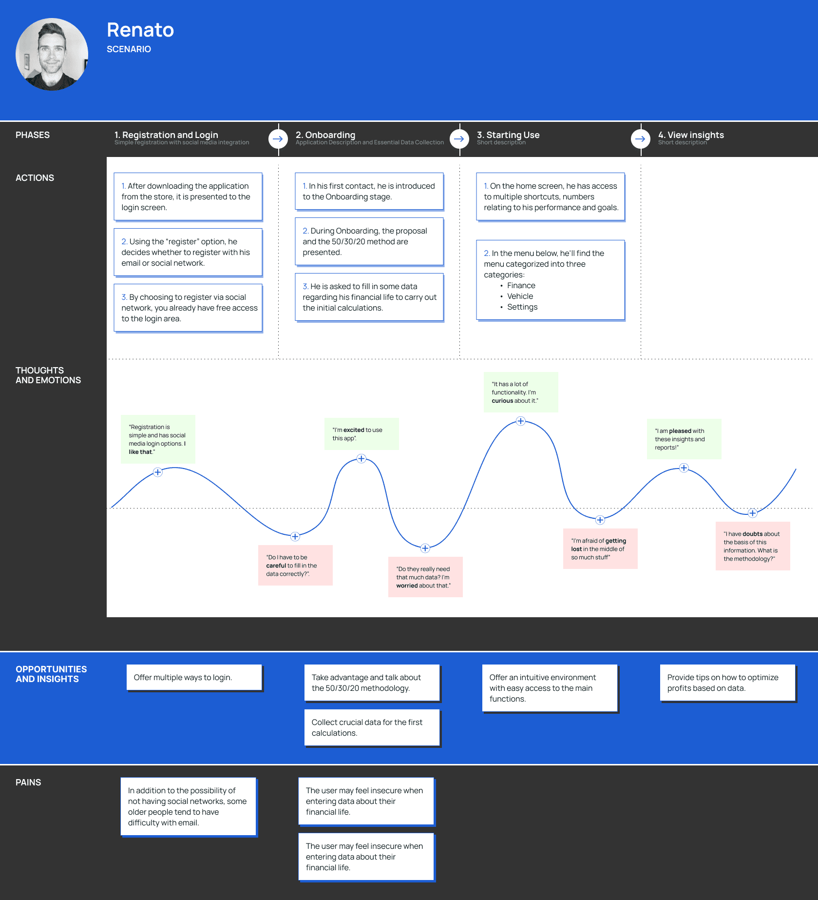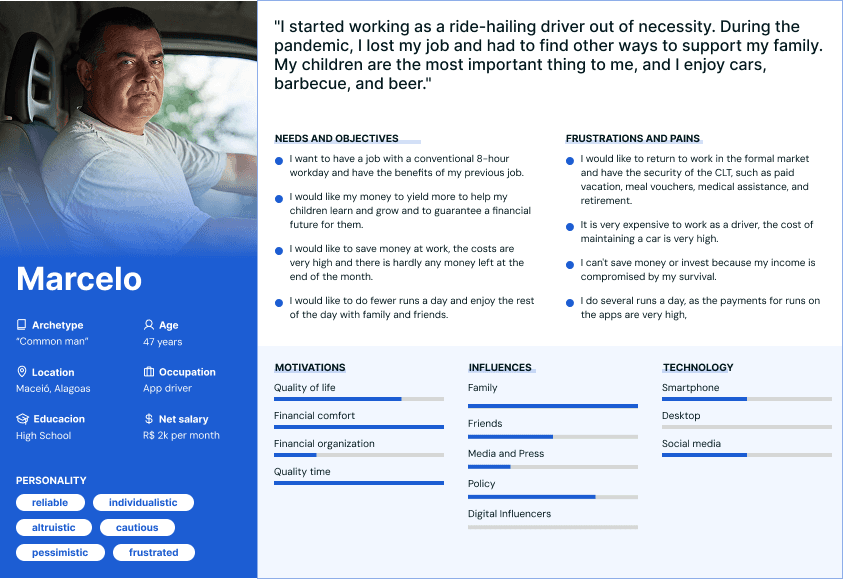 The goal of the real-user research was to uncover pain points and opportunities for app creation. The research was conducted in two stages: first, a quantitative survey was sent to a large number of people to gather data for app development. Then, five qualitative user interviews were conducted as the basis for creating personas. The research sought to identify the app's target audience (motorcycle taxis, ride-hailing drivers, and/or food delivery drivers) and map users' real needs (financial management, security, vehicle maintenance, etc.).